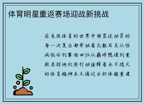在竞技体育的世界中,明星运动员的每一次复出都牵动着无数目光。从伤病低谷到赛场回归,从巅峰隐退到重新启程,他们用行动诠释着永不熄灭的体育精神。本文通过分析体能重建、心理调适、战术革新与社会期待四个维...